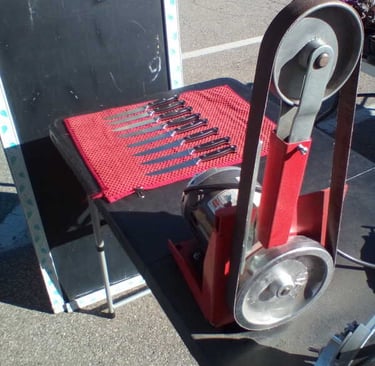 Whether you have full set of kitchen knives or just a pocket knife, it is important to keep the edge sharp both for safety and to make it easy to cut you vegetables or whittle a stick. I promise that you will be satisfied with your blades after I sharpened them. I primarily sharpen using a pair of belt sanders but if you prefer I can also sharpen with a whetstones.